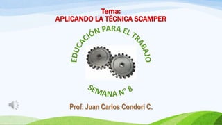 La técnica SCAMPER es una herramienta que permite activar la creatividad y resolver problemas mediante preguntas que obligan a pensar de maneras diferentes. SCAMPER es un acrónimo que representa siete categorías de preguntas: sustituir, combinar, adaptar, modificar, poner otro uso, eliminar y reordenar. Cada categoría proporciona preguntas para explorar nuevas soluciones reimaginando un concepto existente. El documento proporciona ejemplos ilustrativos de cada categoría de pregunta SCAMPER
