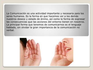 El documento describe las técnicas y habilidades de comunicación efectiva. La comunicación es importante para las relaciones humanas. La comunicación verbal y no verbal son formas clave de comunicación. Escuchar activamente, mostrar empatía, parafrasear y resumir son habilidades importantes para la comunicación efectiva. Barreras como las físicas, semánticas y personales pueden interferir con la comunicación.