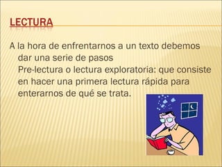 El documento describe los pasos para un estudio eficaz, incluyendo una lectura exploratoria, subrayar ideas claves y frases, elaborar mapas conceptuales para sintetizar la información, planificar el estudio con una distribución adecuada del tiempo, y realizar resúmenes usando el propio vocabulario.