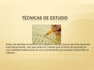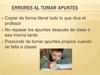 Tomar buenos apuntes es una habilidad fundamental para el estudio. Se deben evitar errores como copiar literalmente todo lo dicho por el profesor o no repasar los apuntes. Entre las recomendaciones para tomar apuntes efectivos se incluyen llevar los materiales necesarios, prestar atención, enumerar y fechar las hojas, dejar márgenes, usar títulos y clasificadores.