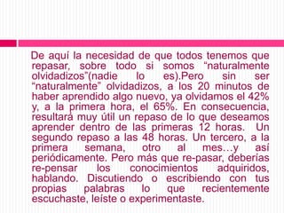 Este documento ofrece consejos sobre técnicas de estudio efectivas, incluyendo comprender el material, repasarlo regularmente, usar claves mnemotécnicas, programar el aprendizaje en periodos cortos, concentrarse, aprender a leer activamente, formular preguntas, elaborar cuadros sinópticos, repasar sistemáticamente y aprender a escuchar de manera crítica.