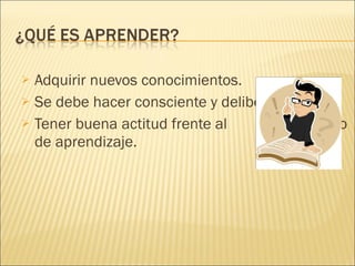 El documento ofrece consejos sobre cómo adquirir nuevos conocimientos de manera efectiva, incluyendo tener una buena actitud, crear las condiciones óptimas para el estudio, organizar el método y tiempo de estudio, y utilizar técnicas como la prelectura, lectura activa, subrayado, esquemas, resúmenes y mapas conceptuales.