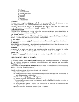 El documento presenta varias técnicas de estudio importantes como la organización, el estudio diario, el método de estudio, la lectura comprensiva y el resumen. Recomienda mentalizarse de la necesidad de estudiar, organizar el tiempo y los materiales de estudio, y utilizar métodos como la prelectura, el subrayado, la toma de notas y la elaboración de esquemas y resúmenes para comprender y retener la información de manera efectiva.