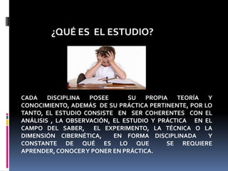 Este documento presenta diferentes métodos y técnicas de estudio, incluyendo condiciones para estudiar efectivamente como tener energía y concentración, y técnicas como previsualizar, hacer preguntas, leer, resumir y memorizar. Explica que cada disciplina tiene su propio conocimiento y práctica, por lo que estudiar implica analizar, observar y practicar de forma constante para aprender. También cubre la importancia de organizar el tiempo y encontrar un lugar adecuado para estudiar.