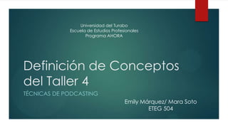Este documento define conceptos relacionados con las técnicas de podcasting como Audacity, Atom, iPod, MP3, MP4 y Ogg. Explica herramientas para crear y alojar podcasts como Audacity, Poderato, Podomatic y Gcast. También describe formatos de audio digitales y elementos como RSS, sincronización y XML.