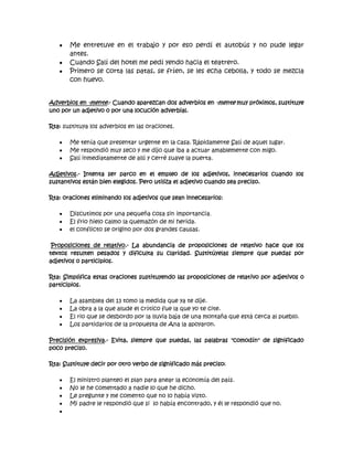 Este documento proporciona consejos sobre técnicas de redacción, incluyendo orden sintáctico, concordancia, repeticiones, conjunciones, adverbios en -mente, adjetivos, proposiciones de relativo, precisión expresiva y dequeísmo. Se dan ejemplos de oraciones que ilustran estos conceptos y se pide corregirlos siguiendo las reglas de redacción.