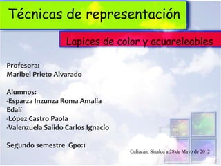 Este documento presenta información sobre diferentes técnicas de representación con lápices de color y acuareleables. Explica conceptos como la teoría del color, los colores primarios, secundarios y terciarios, y cómo se pueden usar los lápices de color y acuareleables para representar elementos como tejas, césped, ventanas, árboles, escala humana y perspectiva en menos de 3 oraciones.