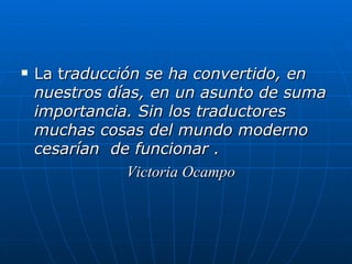 Este documento presenta varias técnicas de traducción. Define la traducción y ofrece citas sobre su definición. Explica la transposición, que implica cambios en la categoría gramatical sin alterar el significado. También cubre la transposición obligatoria, facultativa y cruzada. Otras técnicas discutidas incluyen la equivalencia, adaptación, amplificación y omisión.