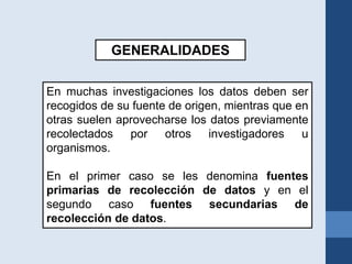 Este documento describe diferentes técnicas e instrumentos para la recolección de datos en investigaciones biomédicas. Explica que las fuentes de datos pueden ser primarias o secundarias. Entre las técnicas primarias se encuentran encuestas, entrevistas, observación y registros. Además, describe tipos de entrevistas, encuestas, escalas de observación e instrumentos, y brinda criterios para la validez y confiabilidad de los instrumentos.