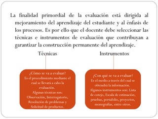Este documento presenta diferentes técnicas e instrumentos de evaluación que pueden ser utilizados por los docentes para evaluar el aprendizaje de los estudiantes de manera que contribuya a su mejoramiento. Describe técnicas como la observación, interrogatorio y resolución de problemas, e instrumentos como lista de cotejo, escala de estimación, pruebas, portafolio y mapas conceptuales. Recomienda que la selección de estas técnicas e instrumentos debe estar dirigida a garantizar la construcción permanente del aprendizaje del estudiante.