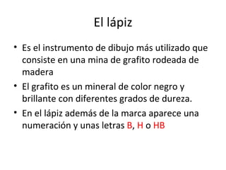 El documento describe diferentes técnicas de dibujo con lápiz y lápices de colores. Explica que el lápiz está compuesto de grafito y madera, y que las letras y números en un lápiz indican su dureza. También cubre complementos como sacapuntas y gomas de borrar, soportes como el papel, y técnicas como líneas y manchas. Finalmente, señala que los lápices de colores contienen pigmentos y aglutinantes y pueden usarse como pinturas acuarelables.