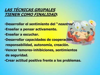 Este documento describe diferentes técnicas grupales y sus objetivos, características y desarrollo. Entre las técnicas descritas se incluyen el simposio, la mesa redonda, el panel, la conferencia, el estudio de casos, el debate dirigido, el foro y la asamblea. El objetivo general de estas técnicas es permitir el análisis y discusión de temas desde diferentes perspectivas para lograr una visión integral y conclusiones consensuadas.