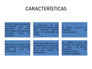 Las técnicas proyectivas son instrumentos sensibles para revelar aspectos inconscientes de la personalidad mediante respuestas subjetivas a estímulos ambiguos. Se analizan globalmente las respuestas para interpretar la estructura básica de la personalidad. Existen técnicas estructurales como el Psicodiagnóstico de Rorschach, técnicas temáticas como el TAT y técnicas expresivas, constructivas y asociativas. El futuro de estas técnicas depende de mayores esfuerzos de investigación para establecer sus