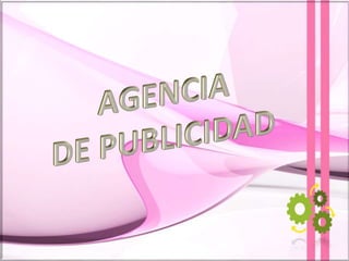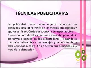 Este documento describe diferentes técnicas publicitarias como la repetición, exaltación, asociación y promociones. También describe los roles de personal clave en una agencia de publicidad como el gerente, director creativo, dibujantes armadores, director de tráfico, director de arte, director de producción audiovisual y ejecutivo de cuentas. Por último, explica tres tipos de agencias de publicidad: independiente, dependiente y departamento de publicidad en la empresa.