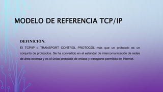El documento describe el modelo de referencia TCP/IP, incluyendo sus capas, protocolos y características. TCP/IP es un conjunto de protocolos que incluye protocolos sin conexión a nivel de red, enrutamiento dinámico, y las capas de aplicación, transporte, internet y acceso a la red. TCP/IP se ha convertido en el estándar para la intercomunicación de redes de área extensa e Internet.