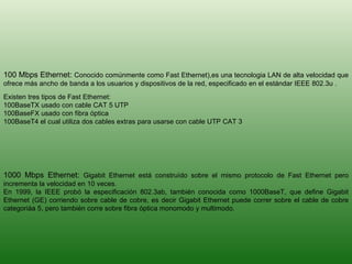 Este documento describe los diferentes tipos de Ethernet, incluyendo 10 Mbps Ethernet, Gigabit Ethernet de 1000 Mbps y Fast Ethernet de 100 Mbps. Explica que Ethernet opera utilizando el protocolo CSMA/CD sobre diferentes tipos de cableado como coaxial, par trenzado y fibra óptica. También describe los diferentes métodos de acceso CSMA como no persistente, 1-persistente y p-persistente.