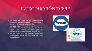 Este documento presenta una introducción al protocolo TCP/IP, que es la base de Internet y permite enlazar computadoras con diferentes sistemas operativos. Explica el direccionamiento IP mediante direcciones numéricas de 32 bits y las clases de direccionamiento A, B, C, D y E. También describe las diferencias entre los protocolos TCP y UDP y la función de los puertos. El documento concluye agradeciendo la atención del lector.