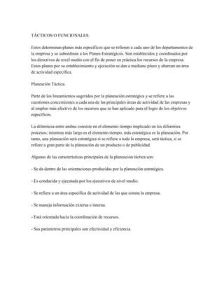 Este documento describe la diferencia entre la planeación táctica y estratégica. La planeación táctica se refiere a planes más específicos para cada departamento de la empresa y se subordinan a los planes estratégicos. Se establecen y coordinan a mediano plazo por directivos de nivel medio para implementar los recursos de la empresa. Mientras que la planeación estratégica se refiere a toda la empresa a largo plazo, la táctica se enfoca en áreas específicas a mediano plazo.