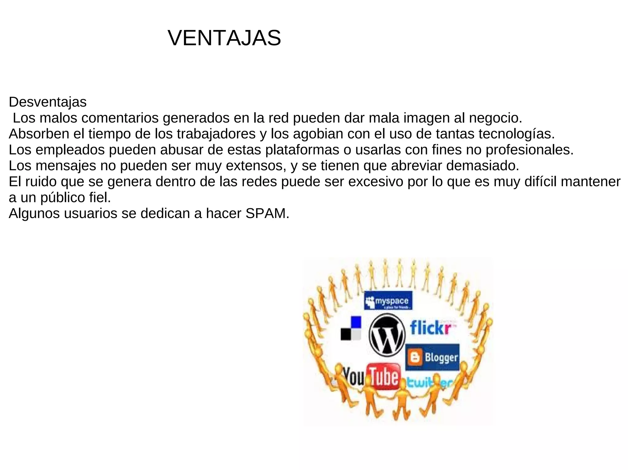 Las redes sociales tienen ventajas como facilitar la comunicación y conexión con otros sin importar la distancia, pero también tienen desventajas como exponer la privacidad de las personas y absorber mucho tiempo. Algunos usuarios pueden volverse adictos a las redes sociales y depender demasiado de ellas. También existe el riesgo de que los datos personales de los usuarios sean utilizados para fines no deseados o puedan ser accedidos por criminales.