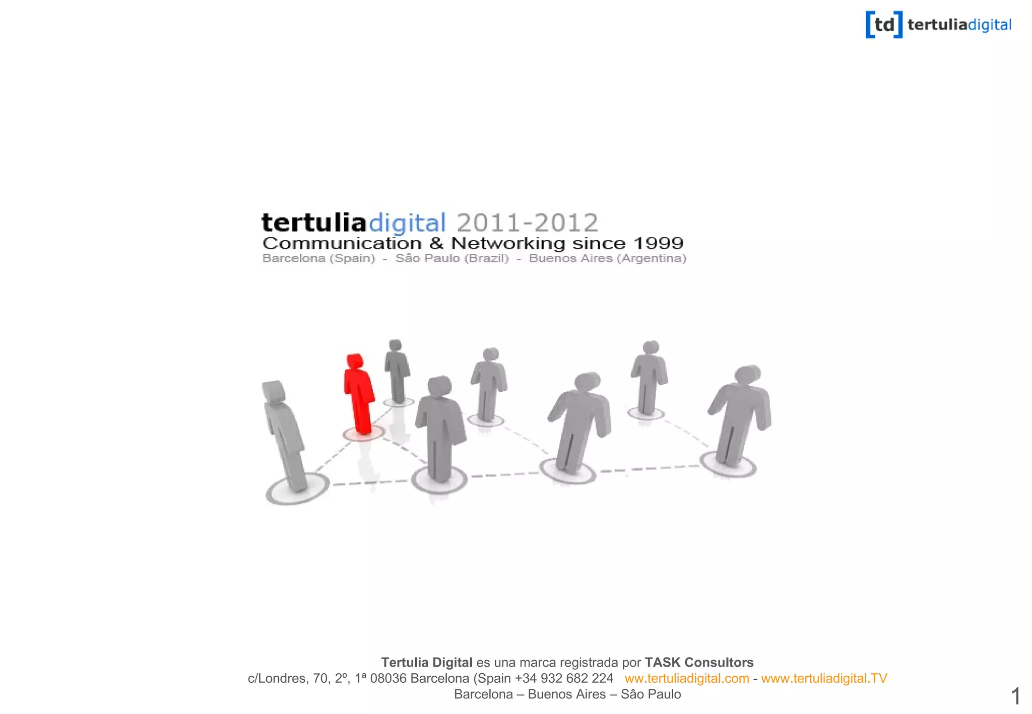 Fundada en 1999 en Barcelona, Tertulia Digital es una consultora especializada en innovación y tecnología con sede en Barcelona y oficinas en Brasil y Argentina. La compañía organiza eventos y promueve la comunicación entre instituciones, empresas y su público objetivo para difundir la innovación y el conocimiento a través de la televisión, radio, prensa digital y redes sociales.