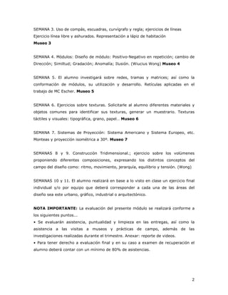 Este documento presenta el programa de trabajo para el área de Expresión y Diseño del módulo de Interacción Contexto-Diseño para el trimestre de septiembre a diciembre de 2012. El objetivo general es que los alumnos aprendan herramientas y materiales básicos de dibujo así como conceptos de diseño como punto, línea, plano y volumen para aplicarlos en propuestas de diseño. El programa consiste en 11 semanas de contenido que cubren temas como geometría, sistemas de proyección, construcción tr