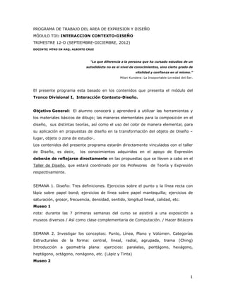 Este documento presenta el programa de trabajo para el área de Expresión y Diseño del módulo de Interacción Contexto-Diseño para el trimestre de septiembre a diciembre de 2012. El objetivo general es que los alumnos aprendan herramientas y materiales básicos de dibujo así como conceptos de diseño como punto, línea, plano y volumen para aplicarlos en propuestas de diseño. El programa consiste en 11 semanas de contenido que cubren temas como geometría, sistemas de proyección, construcción tr