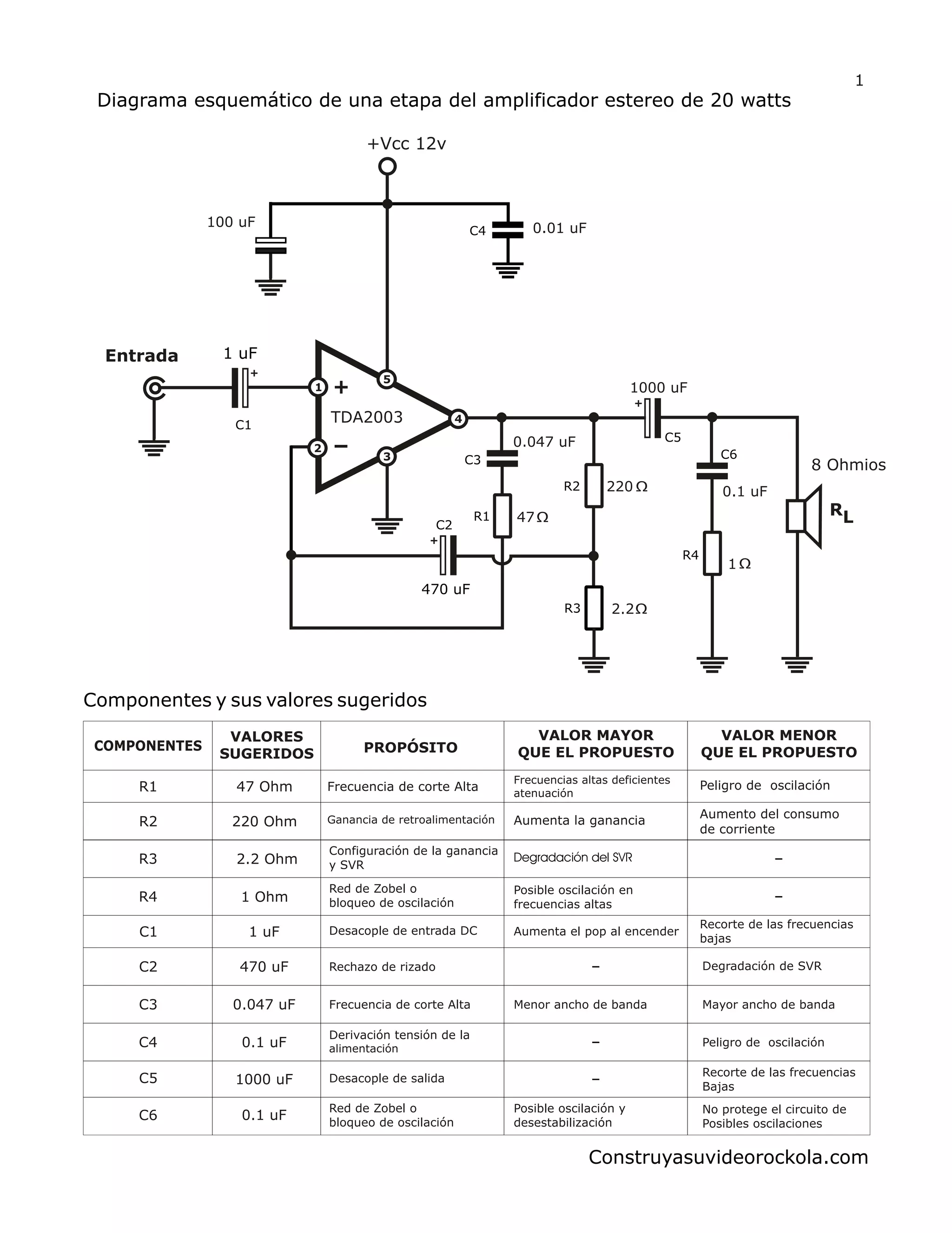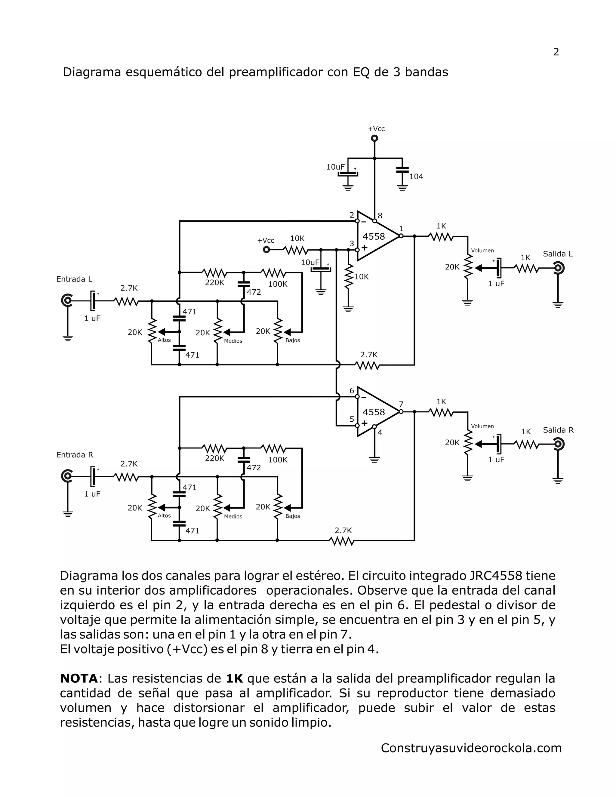 Este documento proporciona los diagramas y listas de componentes para construir un amplificador estéreo con ecualizador de 3 bandas. Incluye diagramas esquemáticos, de conexión y PCB para los circuitos del preamplificador con ecualizador y el amplificador de potencia, así como las listas de materiales requeridos.
