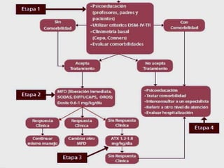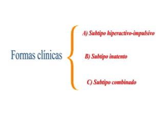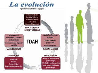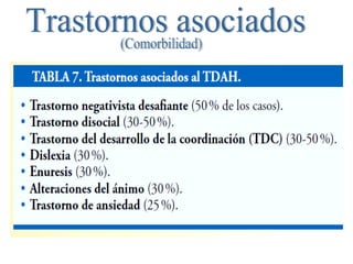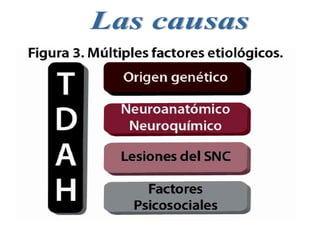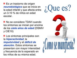 El trastorno por déficit de atención con hiperactividad (TDAH) es un trastorno neurobiológico que afecta entre un 3-10% de niños en edad escolar y se caracteriza por síntomas de hiperactividad, impulsividad y déficit de atención. Estos síntomas se deben a un funcionamiento anormal de los neurotransmisores noradrenalina y dopamina en la corteza prefrontal del cerebro, la cual controla funciones como la atención, concentración e impulsividad. El TDAH suele ser