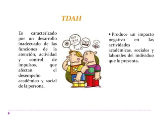 El documento describe el trastorno por déficit de atención e hiperactividad (TDAH), el cual se caracteriza por dificultades en el desarrollo de la atención, actividad y control de impulsos que afectan el desempeño académico y social. El TDAH se presenta desde temprana edad y causa un impacto negativo en las actividades del individuo. Las personas con TDAH tienen problemas de atención, impulsividad e hiperactividad que dificultan seguir instrucciones y mantener un patrón de trabajo consistente.