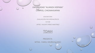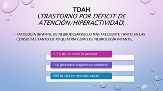 Este documento trata sobre el trastorno por déficit de atención/hiperactividad (TDAH). Explica que el TDAH es el trastorno de neurodesarrollo más común en niños, afectando al 5.7% de los niños. También discute los principales genes relacionados con el TDAH como el transportador de dopamina y serotonina. Finalmente, concluye que se necesitan más estudios genéticos con un mayor número de pacientes adultos y niños para comprender mejor los factores genéticos del TDAH.