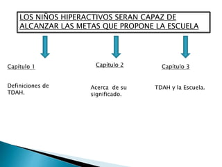El documento presenta información sobre los niños hiperactivos y cómo pueden alcanzar las metas escolares. Define el trastorno por déficit de atención con hiperactividad (TDAH) y explica que involucra movimiento excesivo, dificultad para prestar atención y comportamiento impulsivo. Luego, detalla estrategias que los maestros pueden implementar para ayudar a los niños con TDAH a aprender, como enseñar planificación, usar agendas visuales, ofrecer refuerzos verbales y cambiar entre actividades de alto