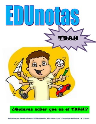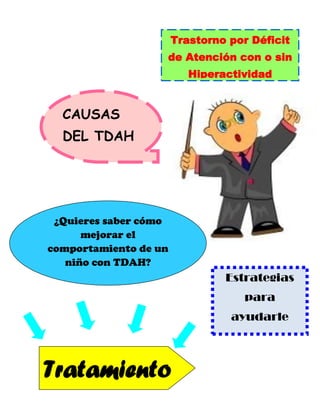 Este documento proporciona información sobre el Trastorno por Déficit de Atención con o sin Hiperactividad (TDAH). Explica las causas, síntomas y tipos de TDAH, así como estrategias para ayudar a los niños con este trastorno, incluyendo tratamiento psicológico, farmacológico y psicopedagógico. También ofrece consejos para padres y maestros sobre cómo mejorar el comportamiento y rendimiento académico de los niños con TDAH.