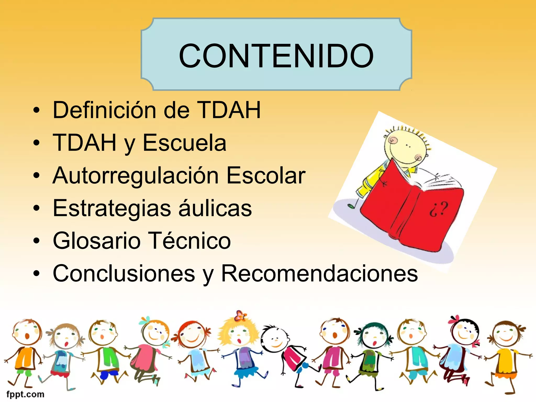 El documento trata sobre estrategias de autorregulación escolar para estudiantes con TDAH. Define el TDAH y explica cómo afecta el desempeño escolar. Explica que los estudiantes con TDAH necesitan desarrollar la autorregulación escolar y que las escuelas deben implementar estrategias como la disciplina positiva, adaptaciones curriculares y actividades lúdicas para apoyarlos.