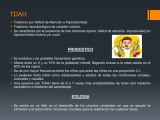 El documento describe el Trastorno por Déficit de Atención e Hiperactividad (TDAH), un trastorno neurobiológico crónico caracterizado por déficit de atención, impulsividad y/o hiperactividad. Afecta del 5-10% de la población infantil y puede persistir hasta la edad adulta. Tiene un componente genético y se manifiesta a través de síntomas como falta de atención, hiperactividad e impulsividad. Su tratamiento es multimodal e incluye terapias farmacológic