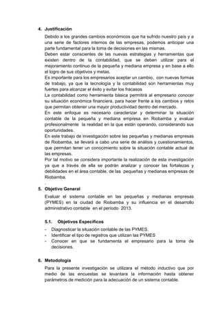 Este documento describe un proyecto de investigación que evalúa el sistema contable de las pequeñas y medianas empresas en Riobamba, Ecuador durante 2013. El proyecto busca diagnosticar la situación contable actual de estas empresas, identificar los registros que utilizan, y conocer cómo toman decisiones los empresarios. La investigación utilizará encuestas y entrevistas para analizar las fortalezas y debilidades contables de las empresas y proponer un sistema contable mejorado.