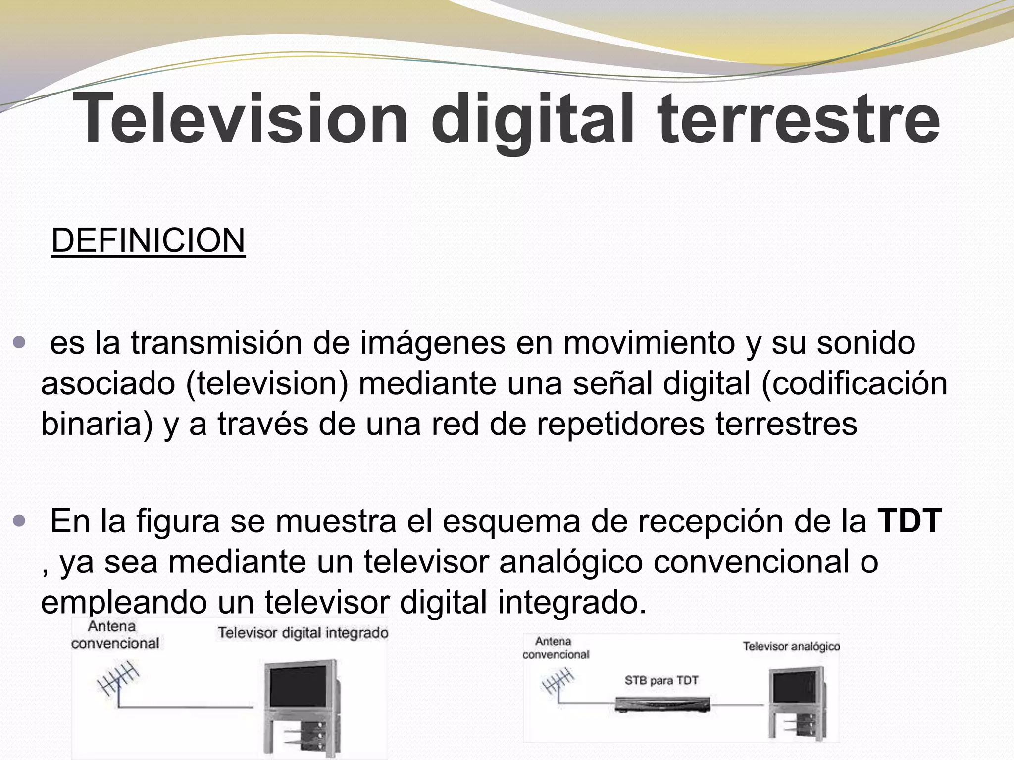 La televisión digital terrestre transmite señales de televisión digitalmente a través de una red de repetidores terrestres, permitiendo una mejor optimización del espectro radioeléctrico y más canales. Usa codificación digital MPEG-2 que requiere un decodificador y ofrece ventajas como mayor ancho de banda, mejor calidad de imagen y sonido, e interactividad.