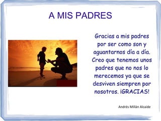 Este documento contiene agradecimientos de varios estudiantes a diferentes personas en sus vidas. Agradecen a sus padres, profesores, amigos y otros familiares por su apoyo, enseñanzas y buenos momentos compartidos. Expresan su gratitud por haberlos criado, educado, acompañado y por los recuerdos significativos que han creado juntos.