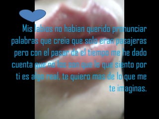 Este poema expresa el amor profundo que siente el autor por otra persona. Describe cómo sus sentimientos han crecido con el tiempo y ahora sabe que lo que siente es real. Disfruta de los momentos que pasan juntos y se siente feliz y en paz cuando está con esa persona. Finalmente, declara su amor por esa persona diciendo "Te amo".