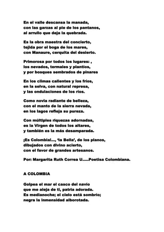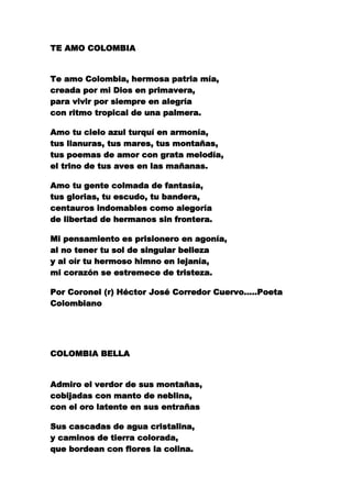El documento contiene varios poemas que expresan el orgullo y amor por Colombia y algunas de sus regiones y ciudades más representativas como Medellín. Los poemas describen la belleza natural del país, su gente y cultura, y expresan la tristeza de estar lejos de la patria.