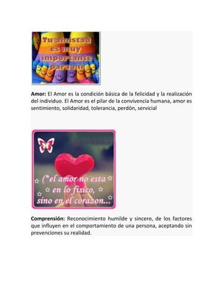 El documento describe los principales valores como la amistad, el amor, la comprensión, la generosidad, la gratitud, la honestidad y la humildad. Explica que la amistad y el amor son los primeros valores que identifican los niños y que conllevan a la armonía familiar. Define el amor como la base de la felicidad individual y pilar de la convivencia humana. Describe la comprensión como el reconocimiento de los demás y la generosidad como dar desinteresadamente. Establece que la gratitud es la máxima expresión de
