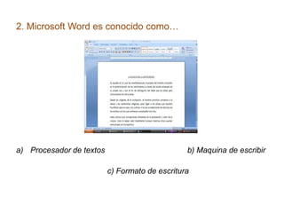 Microsoft Word es un procesador de textos que permite crear, editar y dar formato a documentos. Cuenta con barras de menús, herramientas y opciones para revisar ortografía y gramática que facilitan la escritura y edición de textos. Las ventanas se pueden maximizar, minimizar y restaurar, y existe una barra de estado para ver información sobre comandos y posición del cursor.