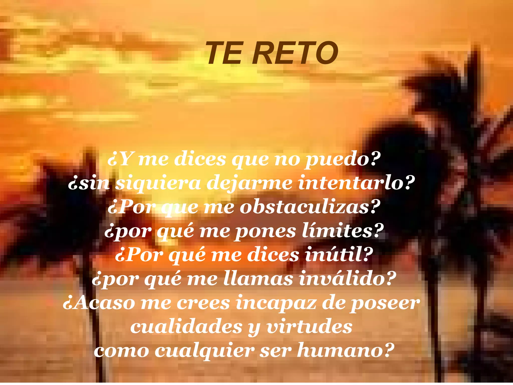 El poema desafía al lector a no subestimar las capacidades de una persona con discapacidad, y a darle una oportunidad para demostrar su valía más allá de las apariencias físicas. El autor pide al lector que mire más allá del cuerpo y conozca su alma, y lo reta a aceptar este desafío para cambiar su perspectiva sobre la discapacidad.