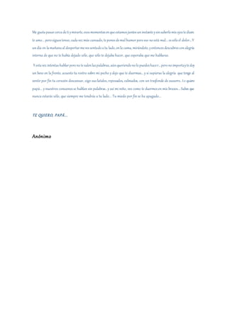 Este documento describe la interacción entre un padre y su hijo. El hijo se siente triste y cansado, pero finge que todo está bien. El padre puede ver a través de la máscara de su hijo y sabe que algo le pasa, aunque el hijo no quiere que nadie se dé cuenta. El padre sufre junto a su hijo sin decir nada. Más tarde, el hijo intenta hablar con su padre sobre lo que siente, pero no puede. El padre lo abraza para consolarlo y dejar que se duerma, contento de poder darle desc