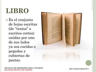 Este documento describe diferentes técnicas de lectura técnica de textos. Explica que un libro es un conjunto de hojas unidas, mientras que un texto es más corto y forma parte de una obra más grande. Además, describe que los libros electrónicos se pueden leer directamente en pantalla o impresos. Finalmente, detalla seis pasos y la técnica ALIRGER para realizar una lectura efectiva.