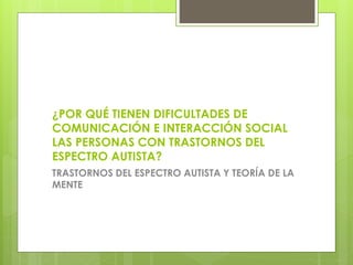 Este documento explora la relación entre los trastornos del espectro autista y la teoría de la mente. Explica que las personas con TEA tienen dificultades en la comunicación e interacción social debido a déficits en la capacidad de atribuir estados mentales a otros y predecir su comportamiento. Estudios muestran que las regiones cerebrales involucradas en la teoría de la mente están comprometidas en el autismo. Las neuronas espejo, relacionadas con la empatía y percepción de intenciones, también mue