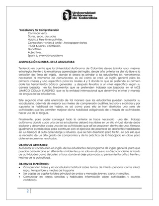 Este documento proporciona información general sobre un curso de Inglés Académico II. Resume los contenidos mínimos del curso, que incluyen reforzar habilidades de escucha y hablar sobre temas como adjetivos comparativos y superlativos. También describe los objetivos del curso, como aumentar el vocabulario de los estudiantes y mejorar sus habilidades de comprensión y expresión oral, lectura y escritura. Finalmente, detalla los métodos de evaluación, que comprenden exámenes parciales y finales, así como
