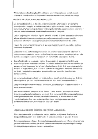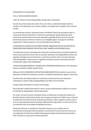 Este documento describe la evolución de las teorías sociológicas sobre las desigualdades sociales en la educación desde los años 1970. En los primeros años de la década, se propusieron reformas educativas para abordar las desigualdades, aunque no tuvieron éxito. Más tarde, teóricos como Althusser y Bourdieu desarrollaron modelos estructuralistas marxistas que analizaban cómo el sistema educativo reproduce las desigualdades de clase. Hoy en día, las ciencias sociales han dado un giro hacia en