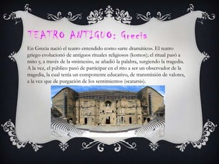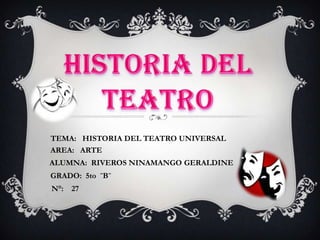 El documento resume la historia del teatro universal desde sus orígenes en la antigua Grecia hasta el siglo XX. Comienza con el teatro griego y su evolución a partir de rituales religiosos, luego pasa al teatro romano, medieval, renacentista, barroco, y así sucesivamente hasta el teatro moderno y de vanguardia del siglo XX. Cubre las principales características y figuras clave de cada período.