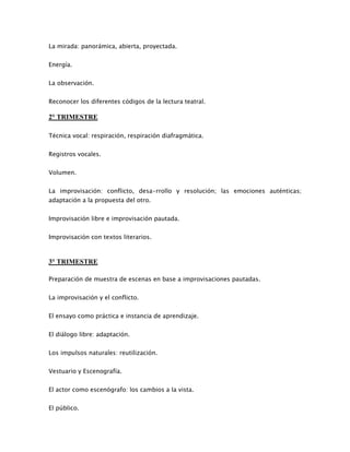 Este documento presenta el programa de teatro para los cursos 2°2° y 2°5° en el colegio "Carlos E. Geniso" durante el año lectivo 2012. El objetivo es que los alumnos se acerquen al teatro tanto teórica como experimentalmente, descubran sus aptitudes artísticas, y mejoren sus habilidades actorales a través de ejercicios corporales, vocales e improvisaciones. El programa se desarrollará a lo largo de tres trimestres cubriendo temas como el espacio escénico, técnicas vocales,
