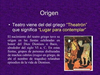 El teatro tiene su origen en las fiestas griegas en honor a Dionisos en el siglo VI a.C., donde grupos disfrazados relataban episodios de su vida. Los griegos asistían a estos espectáculos en estructuras con forma de escalinata para aumentar la capacidad. El teatro pertenece al género dramático y comprende la comedia, la tragedia y el drama. En la antigüedad destacaron genios como Eurípides, Esquilo y Sófocles. Más tarde se desarrolló en Inglaterra